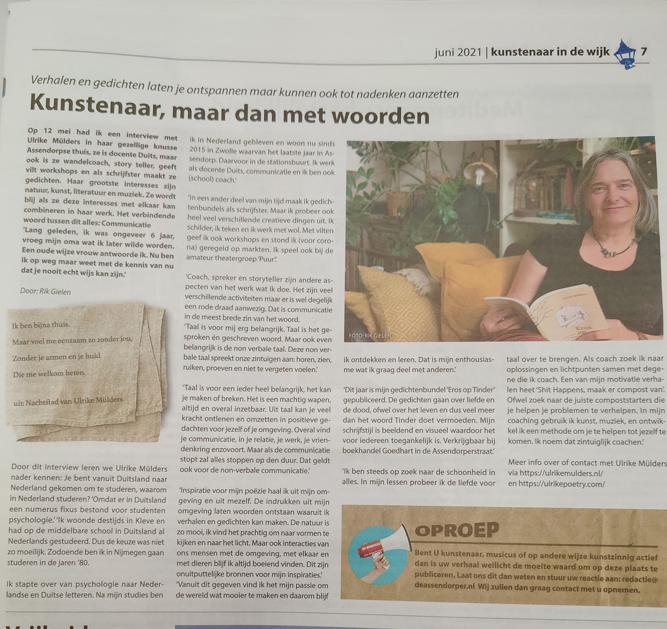 Het was een fijne bijeenkomst met mooie bijdragen van Marieke van Driel en de fluisterdichter Mariska de Groot. De muzikale begeleiding bestond uit de prachtige stem van Caroline Rutten en Dirk Overbeek die op zijn accordeon kan toveren.